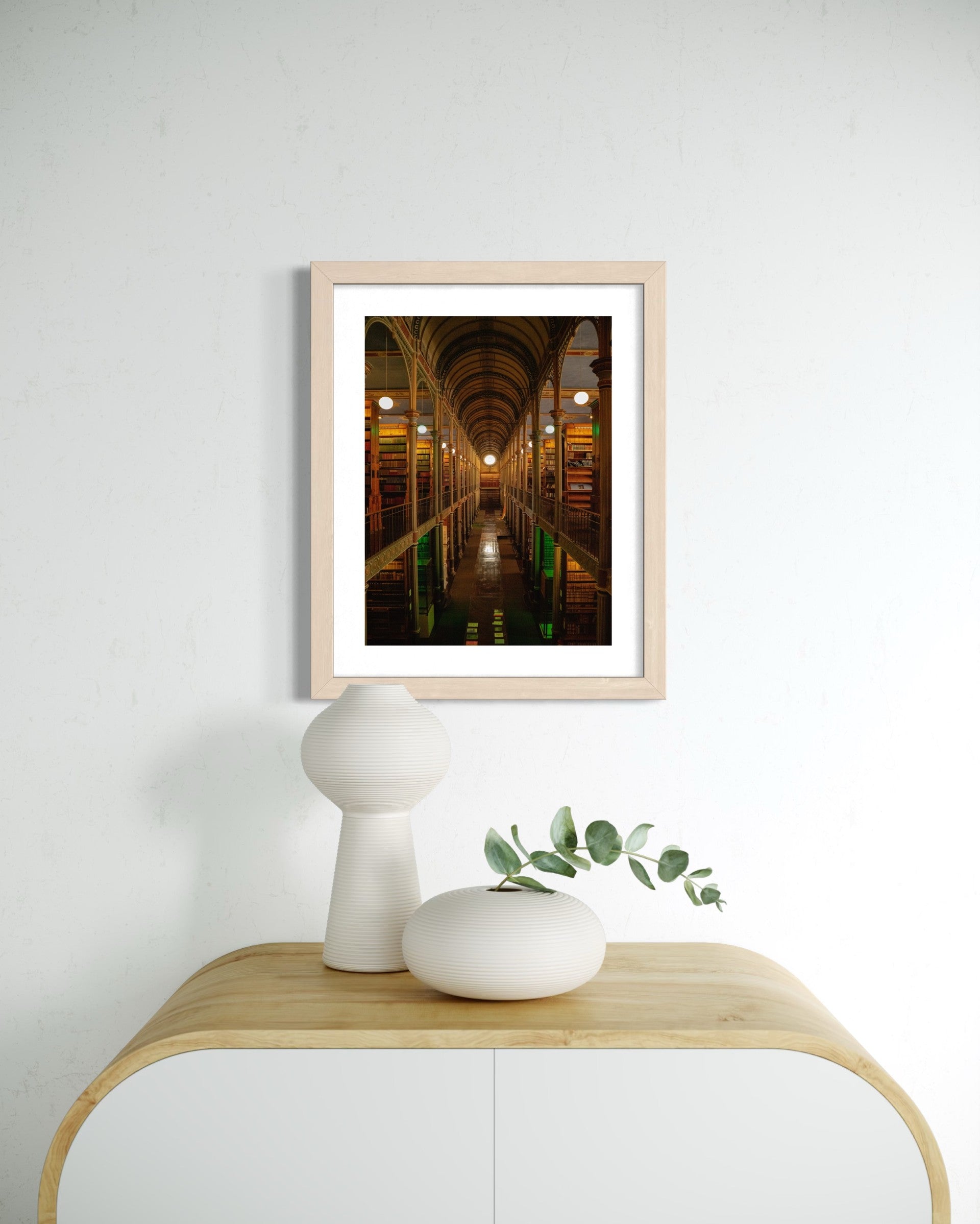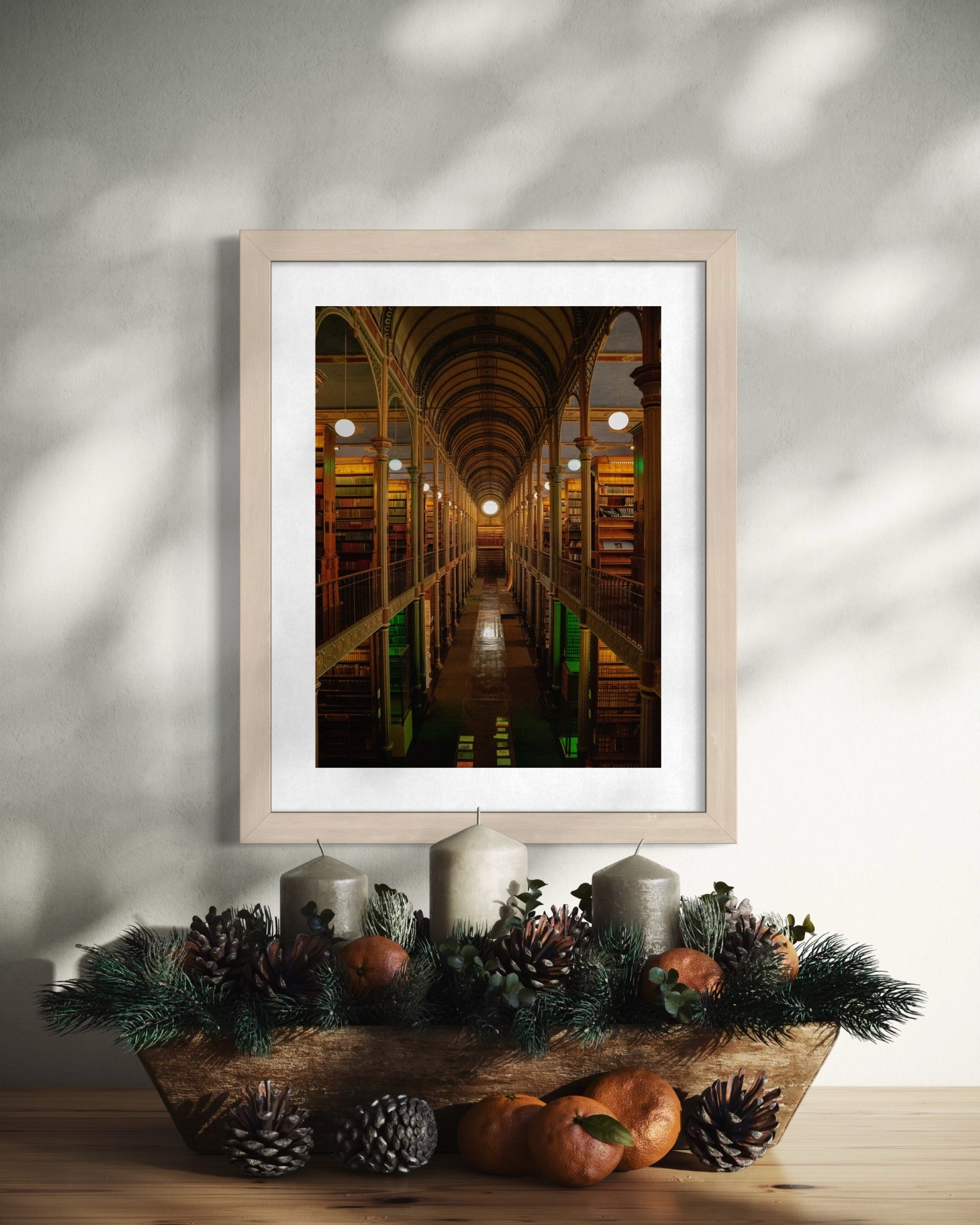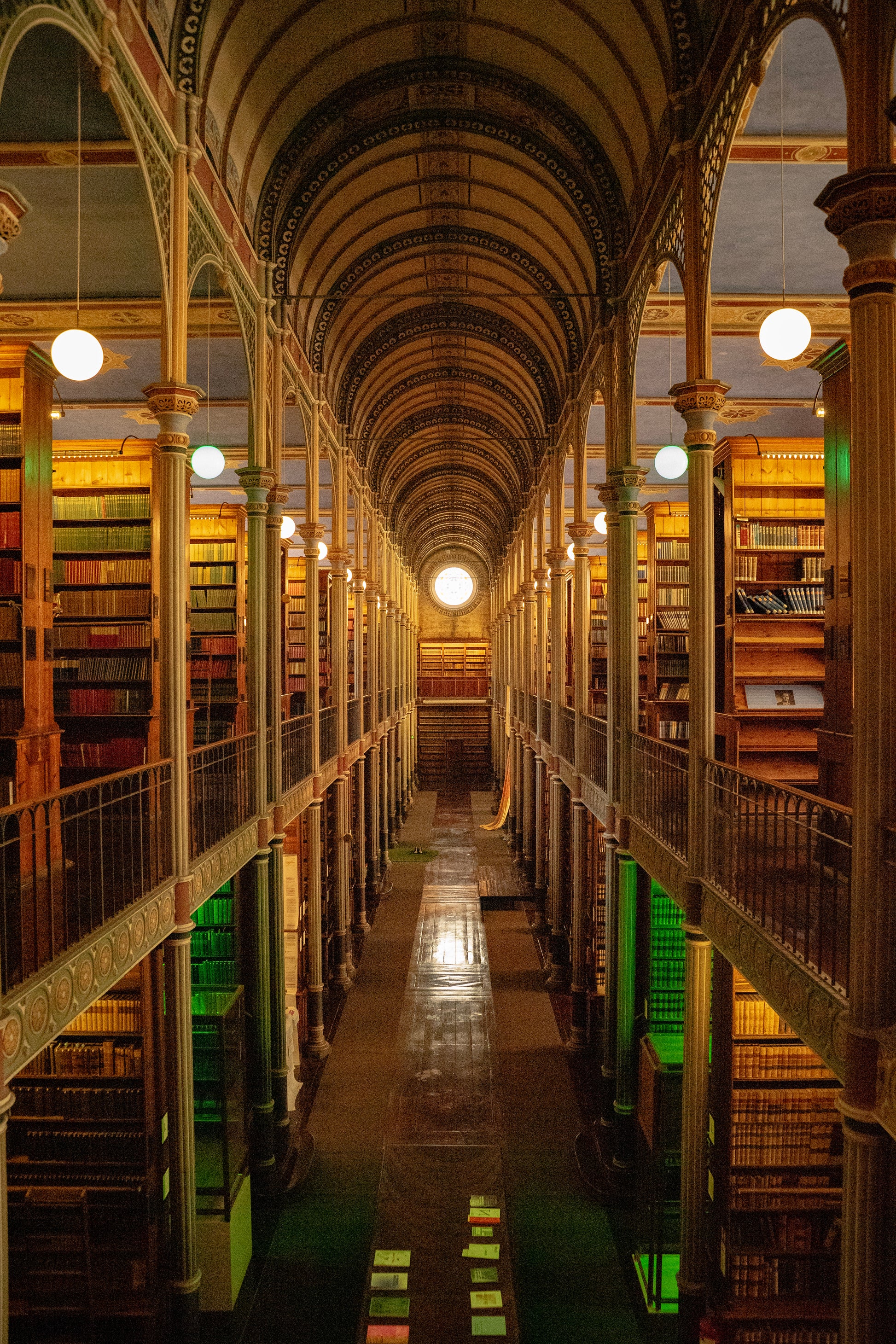 A disciplined perspective through the Old University Library, where structure and ornament settle into rhythm. The image follows repetition and depth toward a distant circle of light.